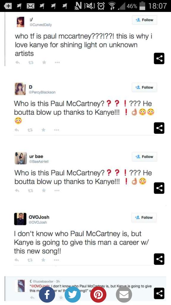 A parceria com Kanye West rendeu aos fãs dele uma pergunta que é difícil acreditar que foi feita: "Quem é Paul McCartney?". Na era digital, os jovens fãs de um gênero diferente, não fazem questão de saber (e estando nessa era, a gente ainda se pergunta como não sabem) quem é Paul McCartney.