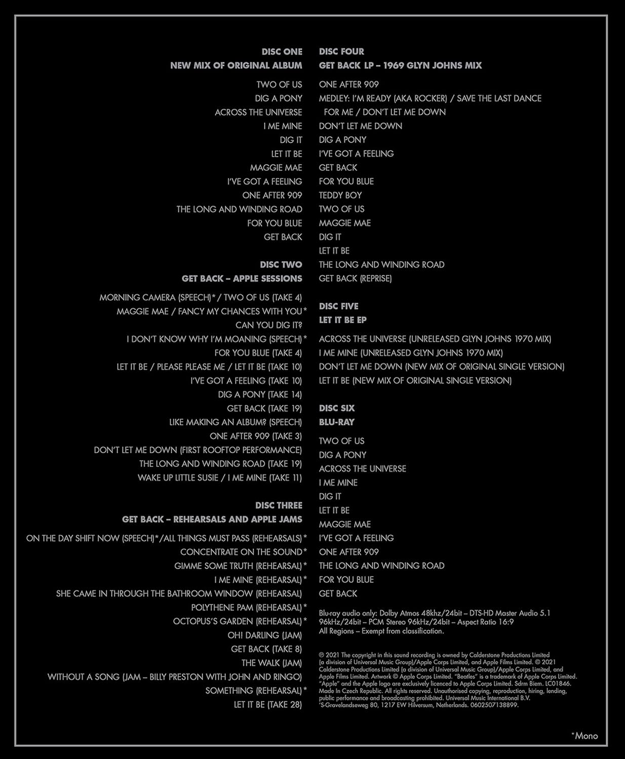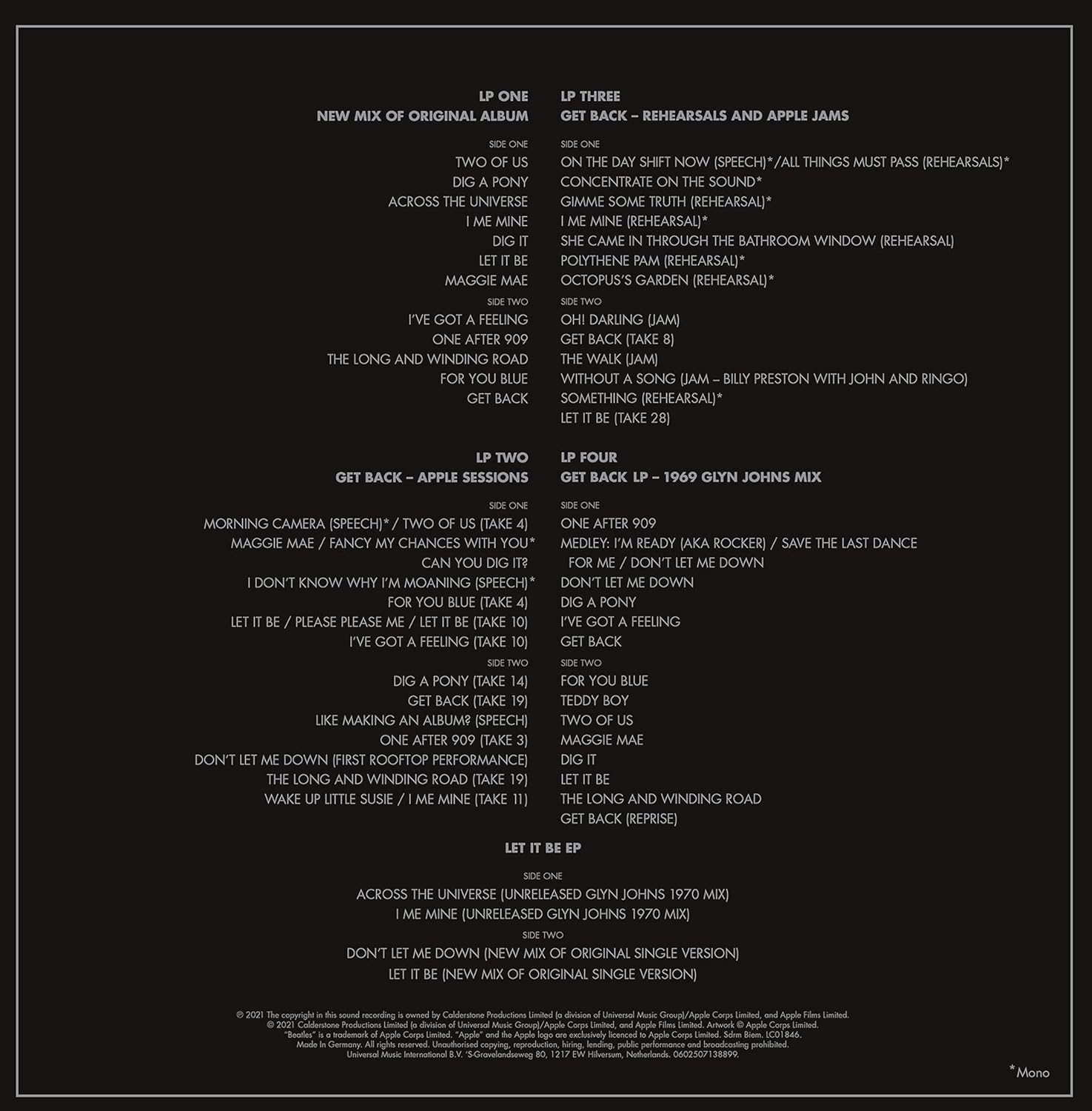 As coleções Super Deluxe também apresentam 27 gravações de sessões inéditas, um EP de quatro faixas 'Let It Be', e o mix de LP estéreo de 14 faixas 'Get Back' nunca antes lançado, compilado pelo engenheiro Glyn Johns em maio de 1969.