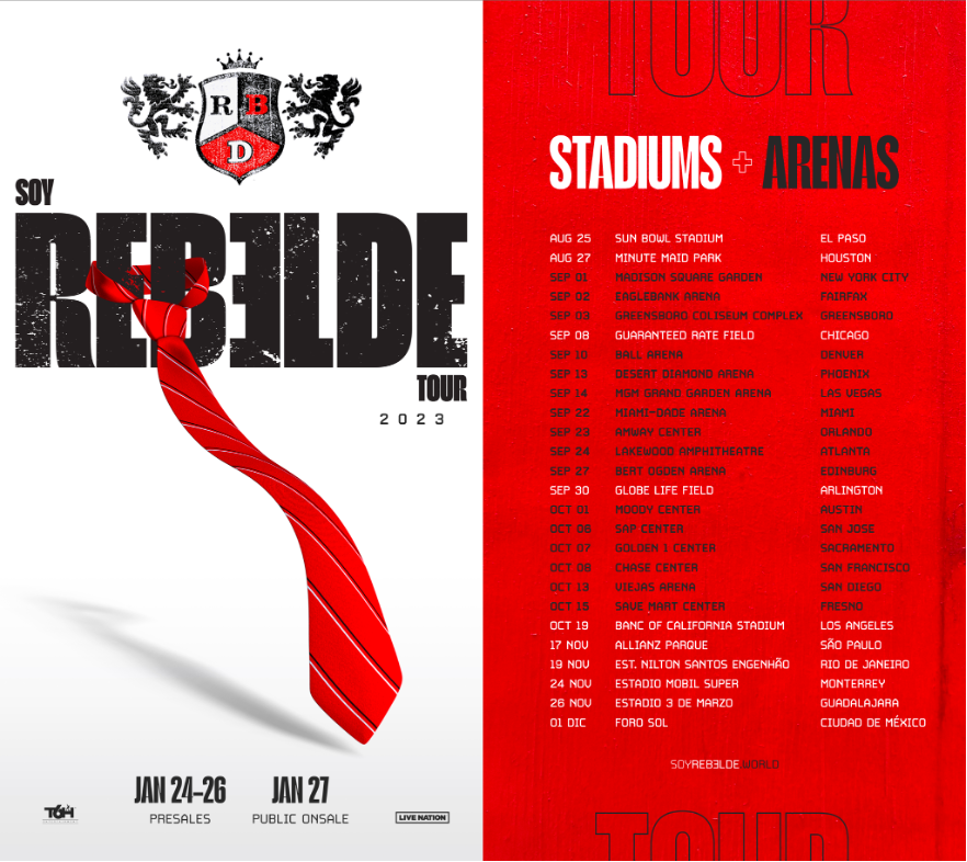 O fenômeno multigeracional RBD - um dos grupos mais relevantes e importantes da música e cultura pop contemporânea - embarcará em uma das turnês mais esperadas da história para celebrar um legado de 20 anos de música, produzida pela T6H Entertainment e Live Nation. A tour passará por 26 cidades entre Estados Unidos, México e Brasil e incluirá shows em 10 estádios e 18 arenas, esperando um público total de 700 mil torcedores, que presenciarão um momento inesquecível e irrepetível na história da música. Os ingressos para todas as datas estarão à venda no dia 27 de janeiro às 10h no Brasil, 12h nos Estados Unidos e às 14h no México. A primeira data da turnê será muito especial para a banda e para os fãs, pois acontecerá no estádio Sun Bowl em El Paso, Texas, localizado perto da fronteira EUA/México. O estádio de 40 mil lugares simboliza o apelo transcultural do RBD e o impacto revolucionário na cultura que uniu muitas nações. O grupo tocará em grandes estádios em Dallas, Houston, Chicago e Los Angeles, além de arenas icônicas como Madison Square Garden em Nova York, Grand Garden Arena em Las Vegas, Viejas Arena em San Diego, entre outras. No México, se apresentarão no emblemático Foro Sol na Cidade do México. No Brasil, os shows acontecerão em São Paulo, dia 17 de novembro (sexta-feira), no Allianz Parque; e no Rio de Janeiro, dia 19 de novembro (domingo), no Estádio Nilton Santos Engenhão. INGRESSOS: Os ingressos para todas as datas da turnê estarão à venda a partir de sexta-feira, 27 de janeiro, às 10h no Brasil, 12h nos Estados Unidos e às 14h no México no SoyRebelde.World. PRÉ-VENDA DOS EUA: Para garantir que os ingressos cheguem às mãos dos fãs, a turnê fez parceria com a plataforma Verified Fan da Ticketmaster nos EUA em duas pré-vendas exclusivas (informações adicionais sobre isso abaixo). Os fãs podem se registrar para ambas as pré-vendas até domingo, 22 de janeiro, às 23h59 ET. Todos os ingressos dos EUA serão disponibilizados durante a pré-venda do Verified Fan, quaisquer ingressos restantes nos Estados Unidos serão vendidos ao público em geral a partir de sexta-feira, 27 de janeiro, às 12h, horário local. FÃ VERIFICADO CITI: Citi é o cartão de crédito oficial da Soy Rebelde Tour nos EUA. Os membros do cartão Citi podem aproveitar uma pré-venda especial do Citi com a oportunidade de Verified Fan para as datas da turnê nos Estados Unidos. Os membros do cartão Citi podem se registrar na quinta-feira, 19 de janeiro, às 20h EST, até domingo, 22 de janeiro, às 23h59 EST, para desbloquear o acesso aos ingressos e usar o cartão Citi para concluir a compra do ingresso, se verificado. A pré-venda do Citi começa na quarta-feira, 25 de janeiro, às 12h, horário local, e continuará até quinta-feira, 26 de janeiro, às 11h45, horário local. Para se registrar para a pré-venda do Citi fornecida pelo Verified Fan, visite CitiVerifiedFan. FÃ VERIFICADO EM GERAL: Os fãs registrados que receberem um código terão acesso à compra de ingressos antes do público em geral a partir de quinta-feira, 26 de janeiro, das 12h às 23h59, horário local. Somente os fãs que receberam um código exclusivo terão a chance de comprar ingressos para as apresentações por ordem de chegada. Para se registrar para a pré-venda de fãs verificados em geral, visite LiveNationVerifiedFan. Além disso, um canal oficial do Discord foi revelado em discord.gg/rbd, onde os fãs terão a chance de comprar NFTs que serão lançados junto com a turnê. BRASIL - Clientes BRBCard terão pré-venda exclusiva nos dias 24 e 25 de janeiro, começando no dia 24/01 às 10h online e às 12h nas bilheterias oficiais. Para o público geral, a venda começa no dia 27 de janeiro, nos mesmos canais e horários. Os ingressos, que podem ser adquiridos em até 5x sem juros por clientes BRBCard e 3x sem juros para os demais cartões, estarão disponíveis online (www.eventim.com.br) e nas bilheterias oficiais (sem taxa de serviço). MÉXICO - A pré-venda exclusiva para os titulares do cartão Citibanamex começará na quinta-feira, 26 de janeiro, às 14h, horário local, através do site Ticketmaster.com.mx. Os ingressos estarão à venda para o público em geral na sexta-feira, 27 de janeiro, às 14h.