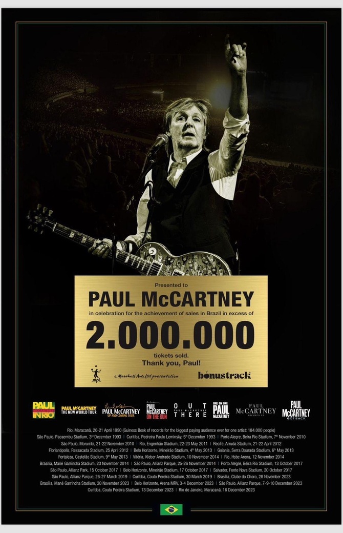 Mas também há glórias mais recentes nas quais pensar. Antes de subir ao palco, Paul recebeu um prêmio especial pela venda de mais de dois milhões de ingressos para shows no Brasil - tornando-o o artista internacional ao vivo de maior sucesso no Brasil.